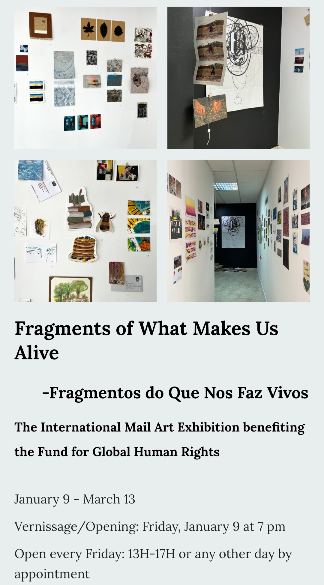 Mail art emerged from the radical spirit of the avant-garde and the playful, subversive energy of Dada, using the postal system itself as a way to disrupt borders, hierarchies, and expectations of what art can be. In this exhibition, “Fragments of What Makes Us Alive,” 184 artists from 27 countries have sent 321 works through the mail, each posted piece arriving as a small testament to that legacy: a personal spark, a quiet act of resistance, a reminder that creativity travels further than any one gallery wall. Together, this dense constellation of envelopes, stamps, smudges, and marks forms a living network that echoes the Dadaists’ belief that art belongs in everyday life—and that even the most modest fragment can carry profound meaning. In a time of ongoing wars and a deeply divided world, these fragments also carry a wish to uplift spirits, to affirm the fragile yet persistent connections between us. The energy they generate extends further: in March, all 319 pieces will be gathered again in an online fundraising auction, with 100% of proceeds supporting the Fund for Global Human Rights. In a time of ongoing wars and a deeply divided world, this future auction is envisioned as another way to uplift spirits and turn the intimate gesture of a mailed artwork into a concrete act of solidarity with people whose fundamental rights are at risk.